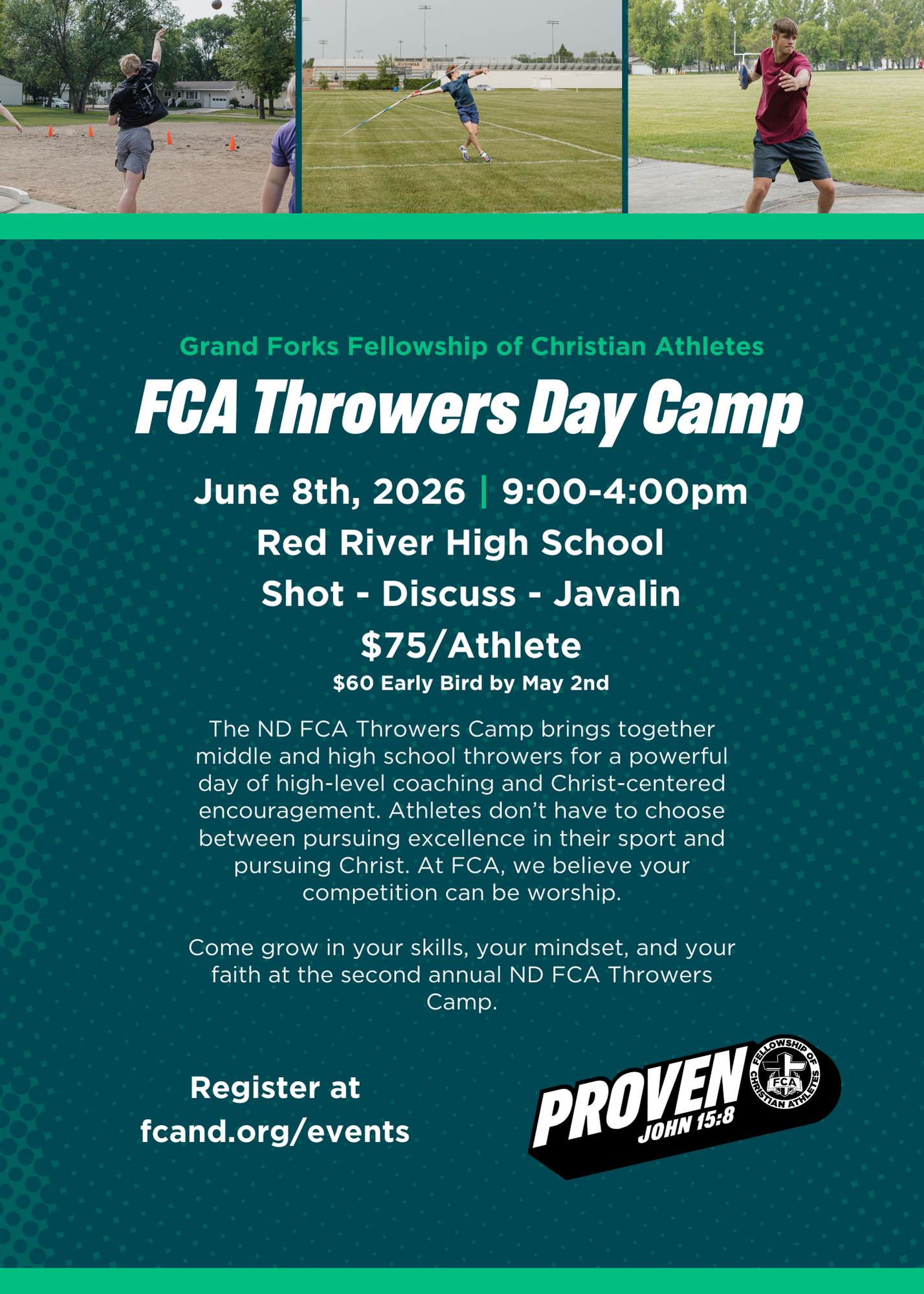 What: The ND FCA Throwers Camp brings together middle and high school throwers for a powerful day of high-level coaching and Christ-centered encouragement. Athletes don’t have to choose between pursuing excellence in their sport and pursuing Christ. At FCA, we believe your competition can be worship.